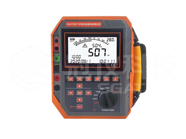 SGAT8806手持式绝缘电阻测试仪,又名兆欧表、高压兆欧表、高压绝缘电阻测试仪等,专用于试验室或现场做绝缘测试。本仪表具有 LCD 大屏幕灰白背光显示、数据存储、数据查阅等功能。同时还具自动计算吸收比和极化指数,并自动储存15秒、30秒、1分钟、10分钟数据。分辨率高,操作便捷,携带方便,准确、可靠、性能稳定,抗干扰能力强。而且具有防震、防尘、防潮结构,是电信、电力、气象、机房、油田、机电安装和维修以及利用电力作为工业动力或能源的工业企业部门常用而必不可少的仪表。它适用于测量各种绝缘材料的电阻值及变压器、电机、电缆及电器设备等的绝缘电阻。数字绝缘电阻表由中大规模集成电路组成,内含高精度微电流测量系统、数字升压系统、自动放电电路。只需要用一条高压线和一条信号线连接被测物即可测量。测量自动进行,结果由大屏幕显示,并将结果进行存储。额定输出测试电压范围100V~2500V,绝缘电阻测量范围0.01MΩ~2.50TΩ。直流电压测量范围0V~1000V DC,交流电压测量范围0V~750V AC。